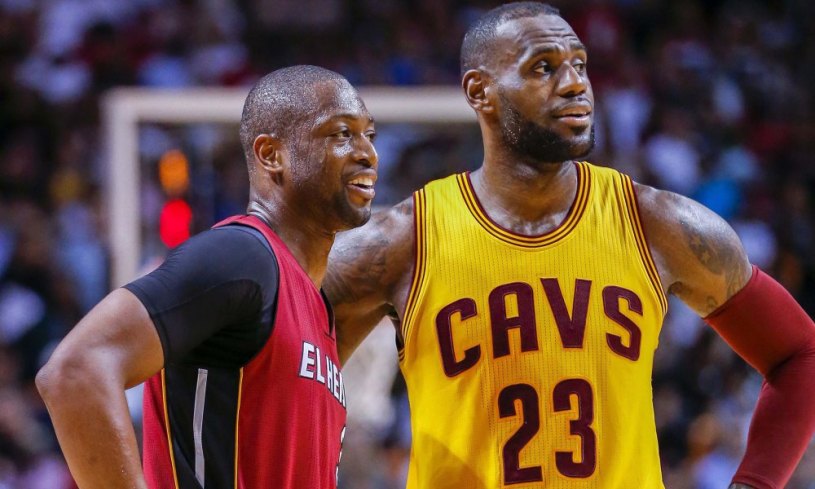 epa05221627 Miami Heat guard Dwyane Wade (L) is greeted by Cleveland Cavaliers forward LeBron James (R) after Wade became the 41st player to score 20,000 points in the NBA during the second half of their NBA basketball game at American Airlines Arena in Miami, Florida, USA, 19 March 2016. The Heat defeated the Cavaliers. EPA/ERIK S. LESSER CORBIS OUT ORG XMIT: ELX14
