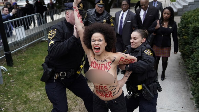 A wild scene took place outside of a Norristown, PA courthouse as Bill Cosby was making his way into the building during his retrial on charges of drugging multiple women. A topless woman appeared out of nowhere and seemed to charge at the comedian. The topless woman had multiple messages painted on her body, including “women” and what appears to be the word “feminism.” Cosby barely reacted to the commotion. It’s not clear if Cosby’s vision is impaired or if he just wasn’t aware of what was taking place around him. Cosby’s lawyers however, looked stunned as the protester took her stance. Nearby police quickly rushed in to subdue the topless protester.