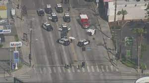 LAPD says the man exited his car wearing body armor, and also with one hand behind his back. LAPD said the officers gave commands for the man to stop. He did not comply. Instead he continued moving toward the officers.