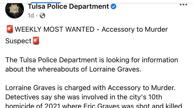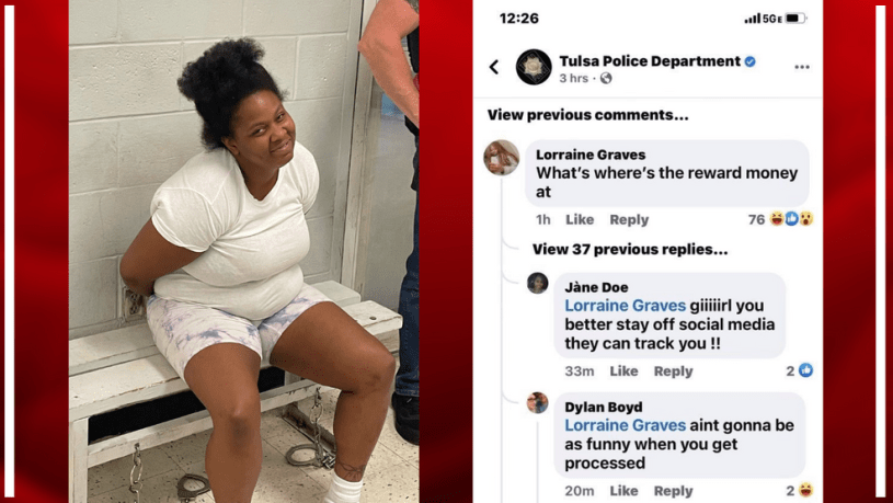 A news report from Oklahoma News 4 said the Tulsa Police Department posted to Facebook on Wednesday asking the public for information on Lorraine Graves. A woman police say was involved in a homicide investigation at an apartment complex in March. Graves decided to comment on the post asking about “reward money” for her capture.