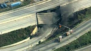A tanker truck fire burning under an overpass on I-95 caused a large section of the highway to collapse in the Tacony section of the city early this morning.